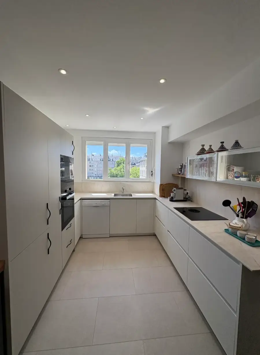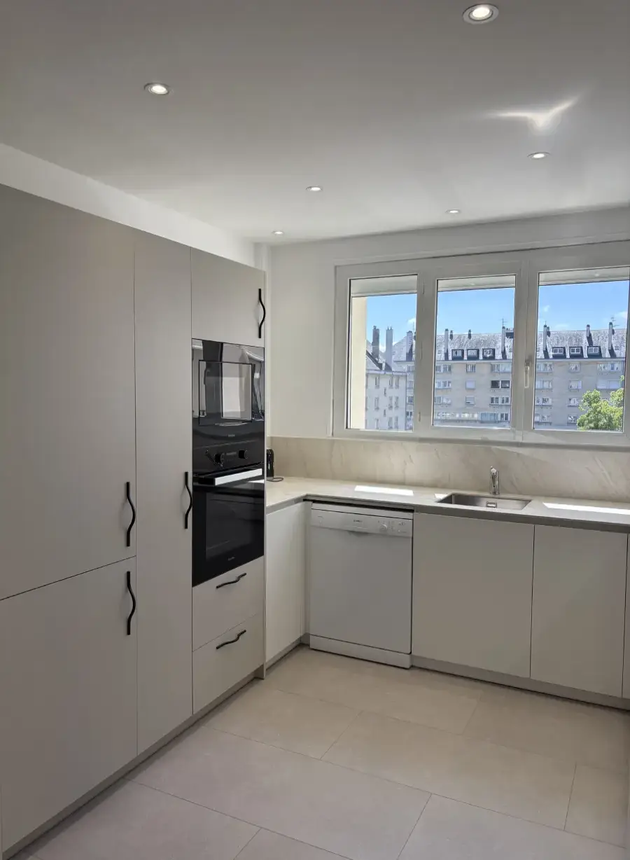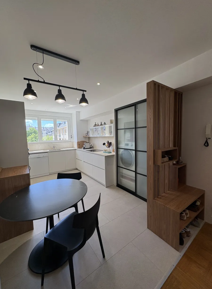 Le cliente souhaitait changer de cuisine pour la rendre plus fonctionnelle et lumineuse. L’espace a été réorganisé avec l’ajout d’un claustra pour structurer l’entrée, l’intégration discrète d’un coin buanderie, et une implantation en U optimisant circulation et rangements. Des teintes claires ont été choisies pour renforcer la luminosité.